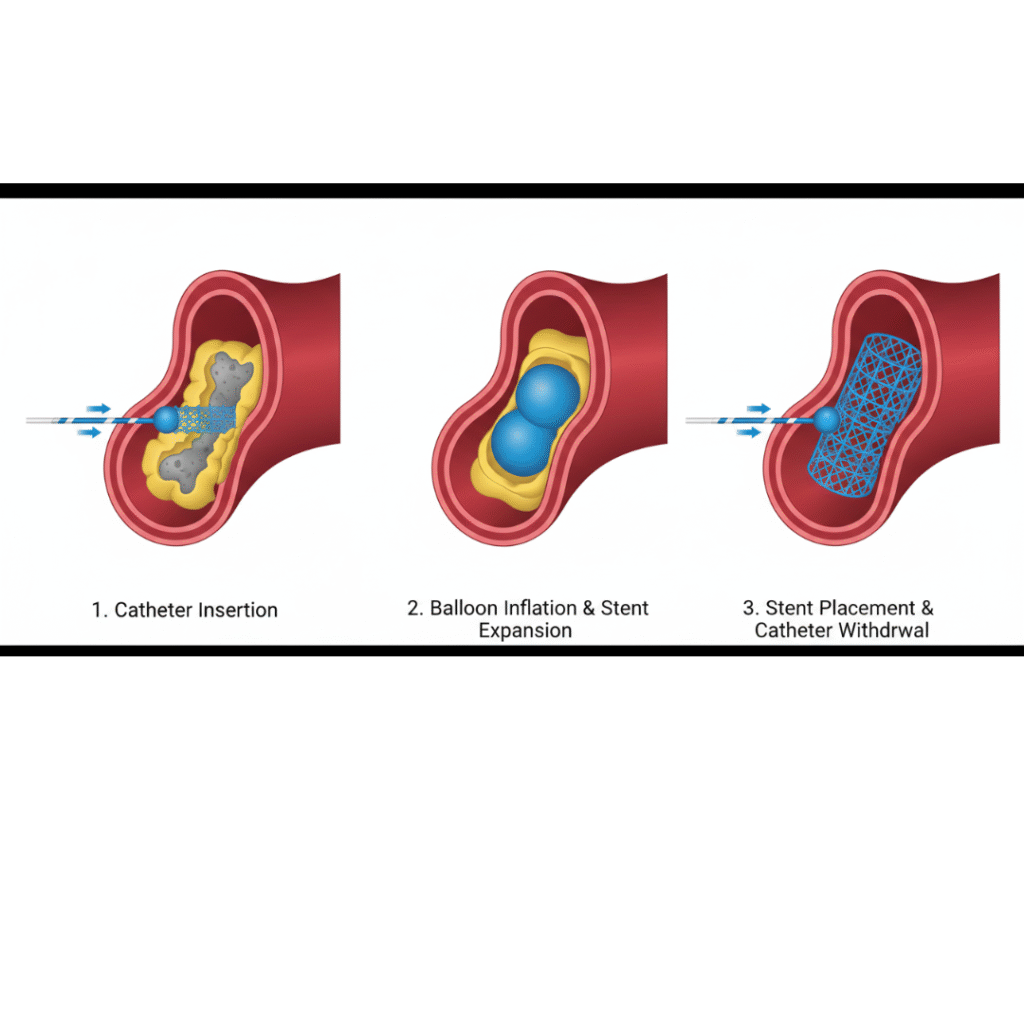 La intervención coronaria percutánea es un procedimiento mínimamente invasivo que restaura el flujo sanguíneo en las arterias coronarias obstruidas. Mediante un catéter especial, se dilata la zona afectada y se coloca un stent para mantener la arteria abierta.